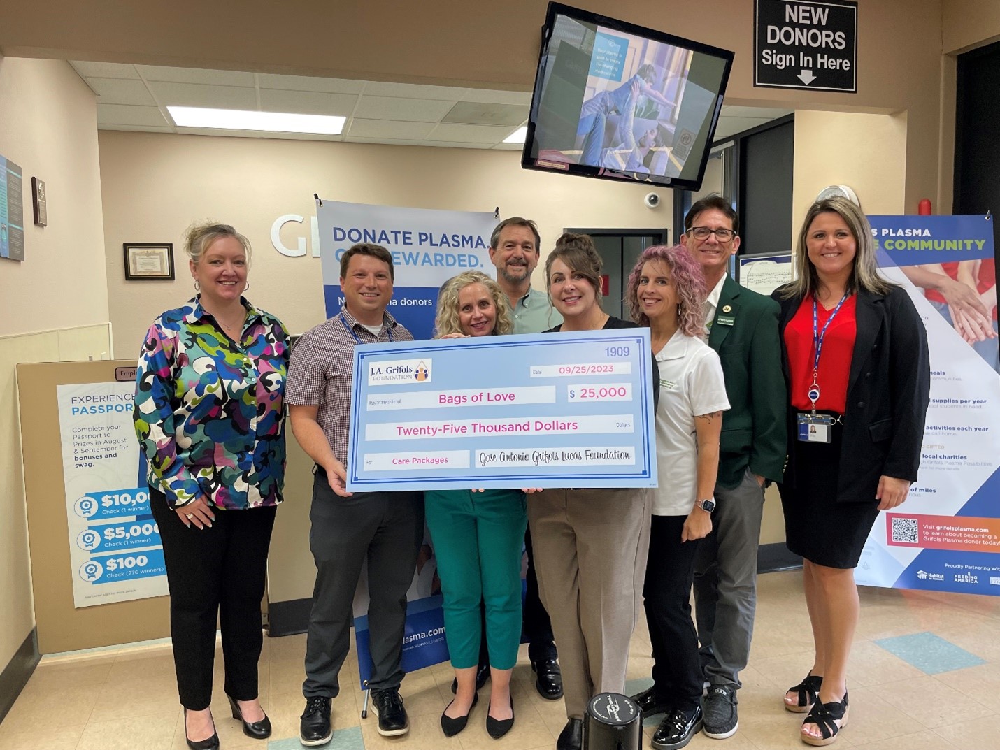 The J.A. Grifols Foundation presented Bags of Love with a $25,000 grant during a check presentation event hosted by Grifols TPR at its plasma donation center in Eugene, OR.