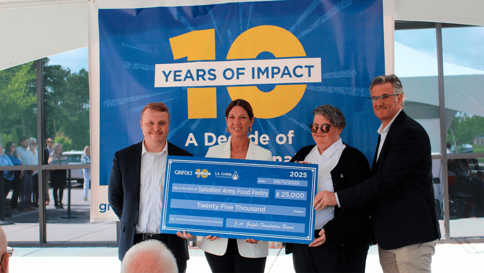 The J.A. Grifols Foundation donated $25,000 to the Salvation Army of Onslow of Jones County in Jacksonville, NC. The funds support their food bank, which provides weekly services to families in both counties. This contribution helps address local food insecurity.